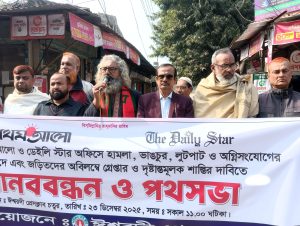 ঢাকায় দৈনিক প্রথম আলো ও ডেইলি স্টার অফিসে হামলা, ভাংচুর, লুটপাট ও অগ্নিসংযোগের প্রতিবাদে এবং এই ঘটনায় জড়িতদের অবিলম্বে গ্রেফতার ও দৃষ্টান্তমূলক শাস্তির দাবিতে ঈশ্বরদীতে মানববন্ধন ও পথসভা অনুষ্ঠিত হয়েছে।